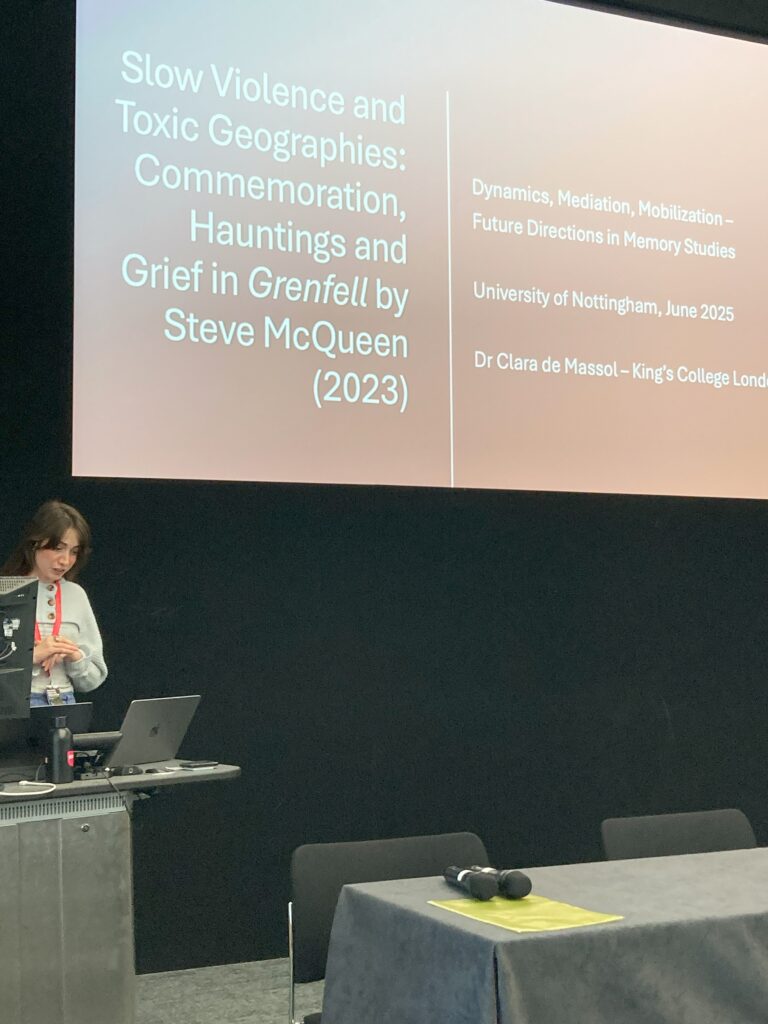 Clara’s presentation examined the film Grenfell by Steve McQueen (Serpentine Gallery, 2023), which commemorates the Grenfell Tower fire on June 14th, 2017, in West London. This catastrophe highlighted issues of neoliberalism and austerity and their entanglement with slow violence and toxic contamination. Clara’s talk explored questions of necropolitics, hauntology, and toxic geographies, considering how contemporary catastrophes are commemorated.