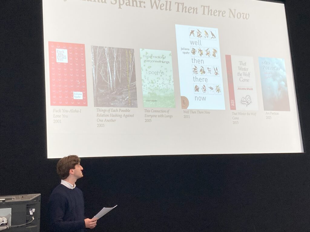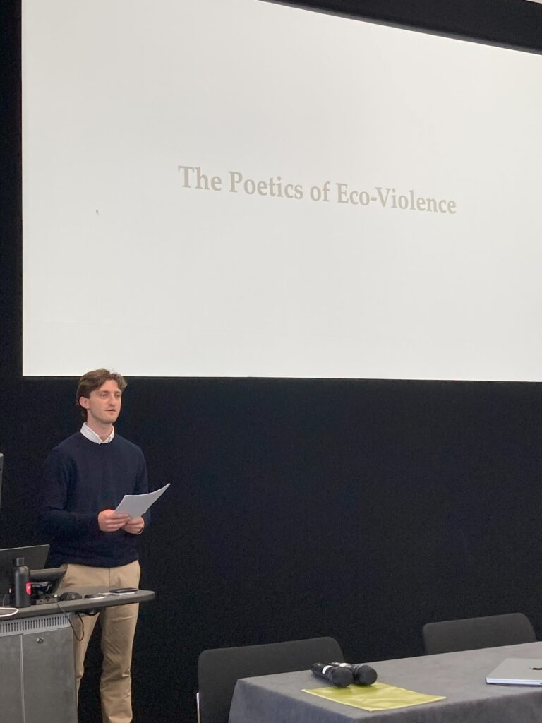 Tom considered how the ecopoetry of Juliana Spahr interrogates poetry’s capacity to bear witness to eco-violence. Tom’s talk explored some the aesthetic repertoires used by Spahr – specifically parataxis, lists, and catalogues – to expand ‘witnessing’ in terms of ecological relations. The paper proposes that Spahr’s ecopoetry engages in ‘ecopoetic witnessing’ – a testimonial process in poetry that expands who counts as witness to include the more-than-human, implicating the poem and its reader in bearing witness to these more-than-human testimonies. Ecopoetic witnessing, Tom suggested, may help us reimagine our notion of witnessing in an ecological sense, which may contribute to expanding our understanding of ‘memory’ on similar ecological terms